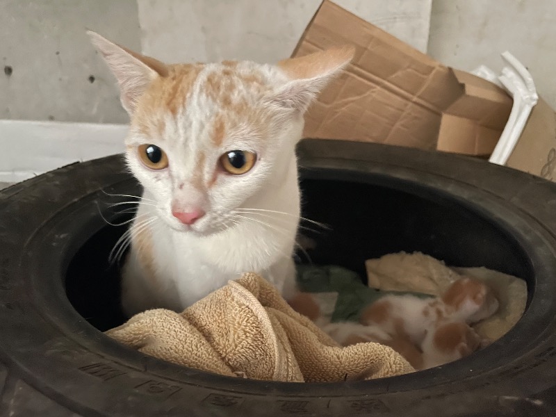 审核通过上班附近流浪橘白母猫,自25年10月至26年在3月,已经生过两窝小猫,现如今小猫刚满月未断奶 预约时间:2026/03