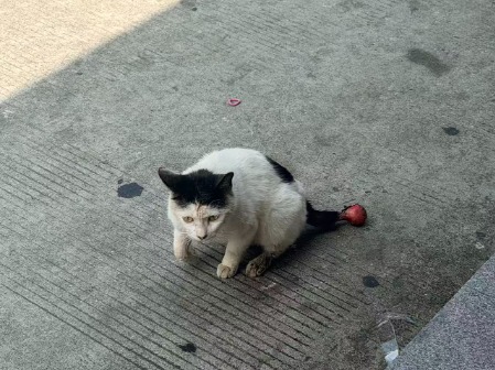 动物情况:这只黑白小猫是近年关时在公司门口(燕川鹏鼎控股)遇到的,初见他时被严重的尾巴惊到了,感慨小猫这一路是多么痛苦走过来。小猫尾巴末端有一个巨大的脓包(不只是硬的还是软的)后腿看起来也是有伤,精神状态也不是很好,但小猫很亲人。小猫一般在中午十二点或下午六点左右(人少的时候)会出来晒太阳,其他时候很难看到他,现在正在想办法将他抱去医院治疗,希望能够申请下救助折扣,让小猫重回健康