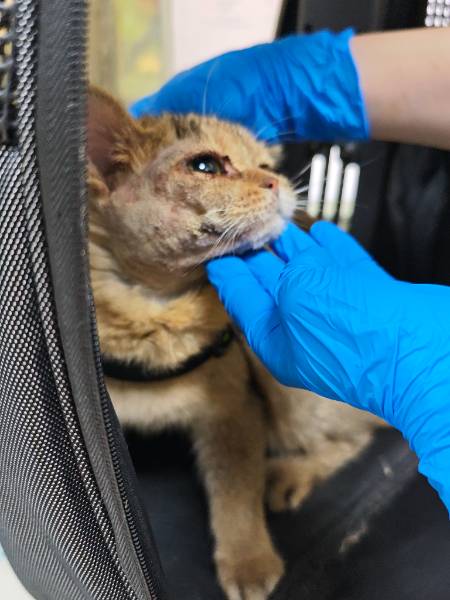 动物情况:在小区遇到的流浪猫,头面部严重皮肤病,很多结痂,耳朵脏耳螨严重。