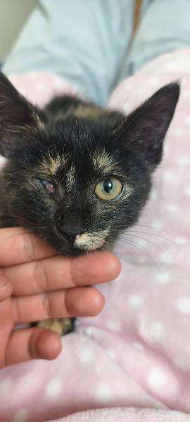 动物情况:半夜在小区花坛遇到的小流浪猫,不怕人一直在花坛叫,发现时一只眼睛流脓睁不开,以为是炎症,回家擦干净后发现眼球已经萎缩,精神状态良好,无其它明显外伤,先放在家安置,第二天白天再送医