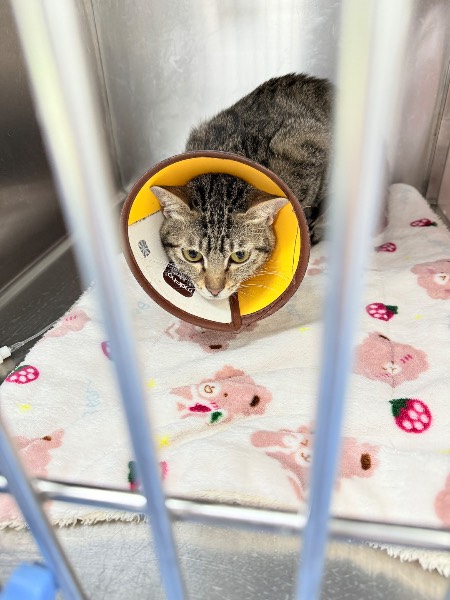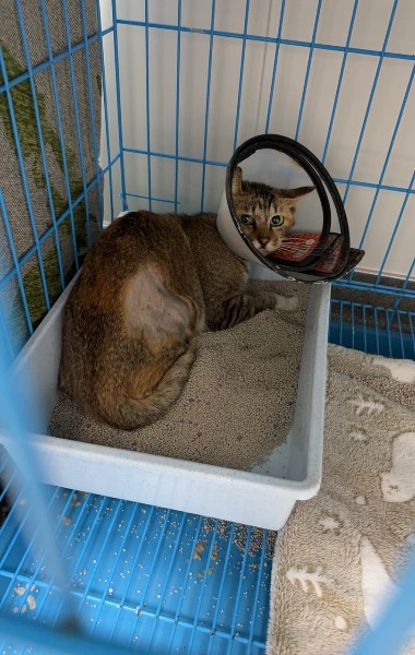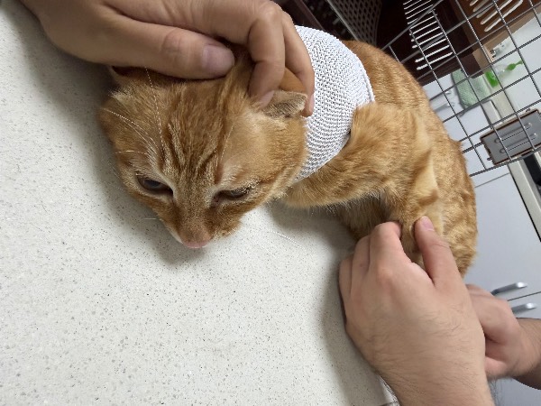 动物情况:1月6号在公司附近垃圾桶发现的流浪猫,精神状态尚可,能吃能喝,后腿有点无力,1月8号送到宠物医院就医,检查结果为左后腿骨折瘸了