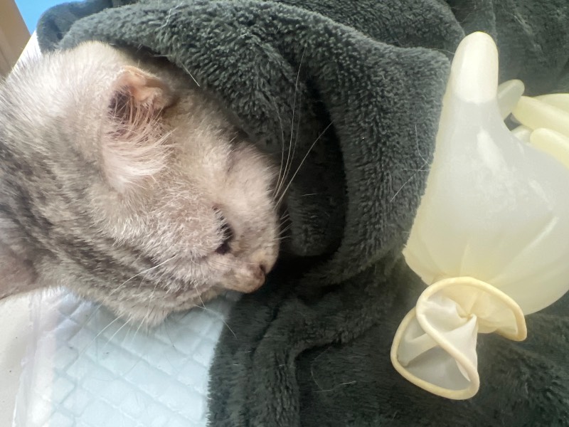 动物情况:小区发现的,是一只新来的猫,黑灯瞎火,恍惚看见好像身上有一个红色绳子勒住。因为猫猫行踪不定,追踪了很久,基本确认应该是猫猫带了项圈,右前肢套过去,被勒住了。动用了所有能用的人力物力,终于用抄网抓住,当即送医,由医生帮忙给猫猫麻醉后拍的照片。很痛!还好抓到了!