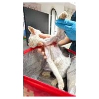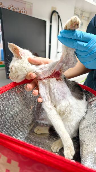 动物情况:本人于2月3日早上9点左右在泰华梧桐岛14B一楼发现一只受伤的小猫,仔细查看后疑似被人虐待导致,伤口从脖颈处一直到左前腿下方,当天中午送去医院面诊,经医生确认,应该是被绳子勒造成的伤口,初步诊断主要是外伤,需要每天清理伤口并用药,目前已安置在医院治疗休养。
